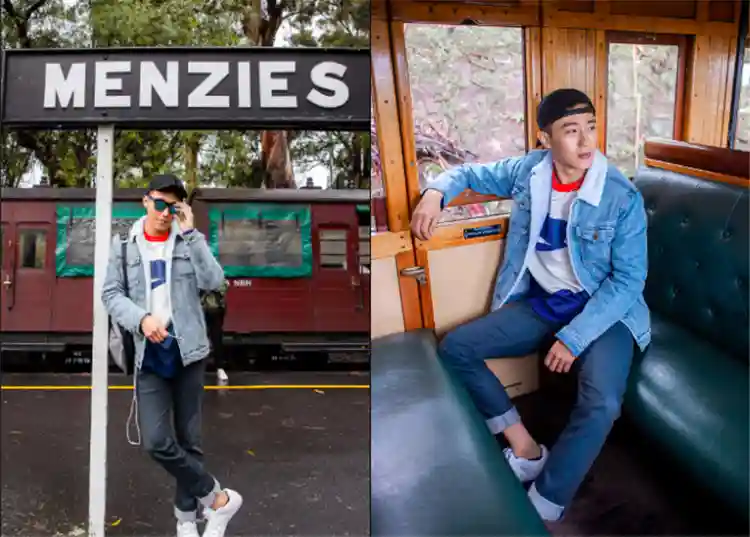 浴室王森穿了红蓝撞色的T恤,并且搭配牛仔棉外套和牛仔裤,