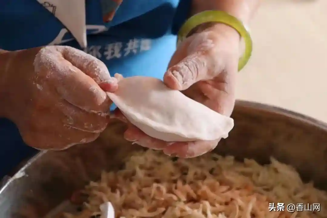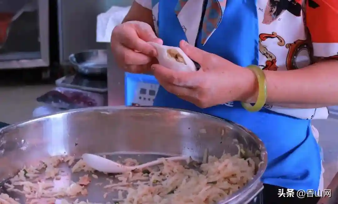 拿起一团粘米粉,按扁,将粉团捏成碗状,塞入以沙葛、虾米、猪肉做成的满满的馅料,然后飞快地收边、折花边,一气呵成,形状完美,每个菜角都像艺术品。