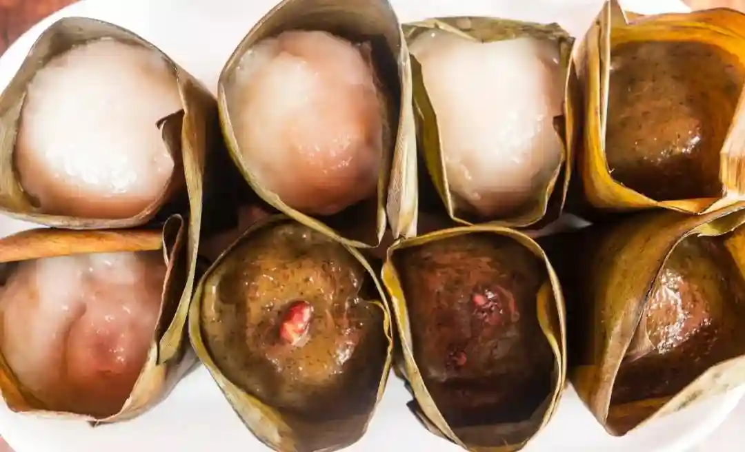 叶子要选用香蕉叶,剪成小块,洗净后用开水烫过,再擦干备用。包的时候蕉叶要高过糍仔,因为糍仔蒸熟后会胀大。