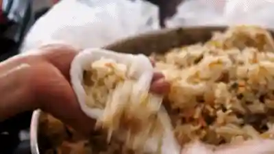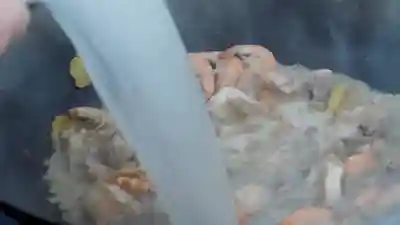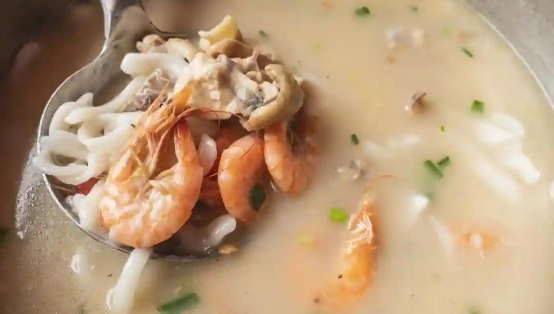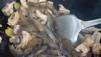 这份食物的鲜味来自汤底,首先用姜片把鸡块炒熟,放入鲜虾同炒,再倒入事先煮好的猪骨沙白汤同煮,米粉条吸取了汤水,每一口都是鲜甜。