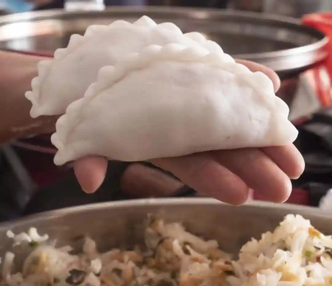 菜角观摩伯母包菜角,拿起一团粘米粉,先是按扁,再用拇指和食指的力量将粉团捏成圆碗,塞入满满馅料,收边、折花边。