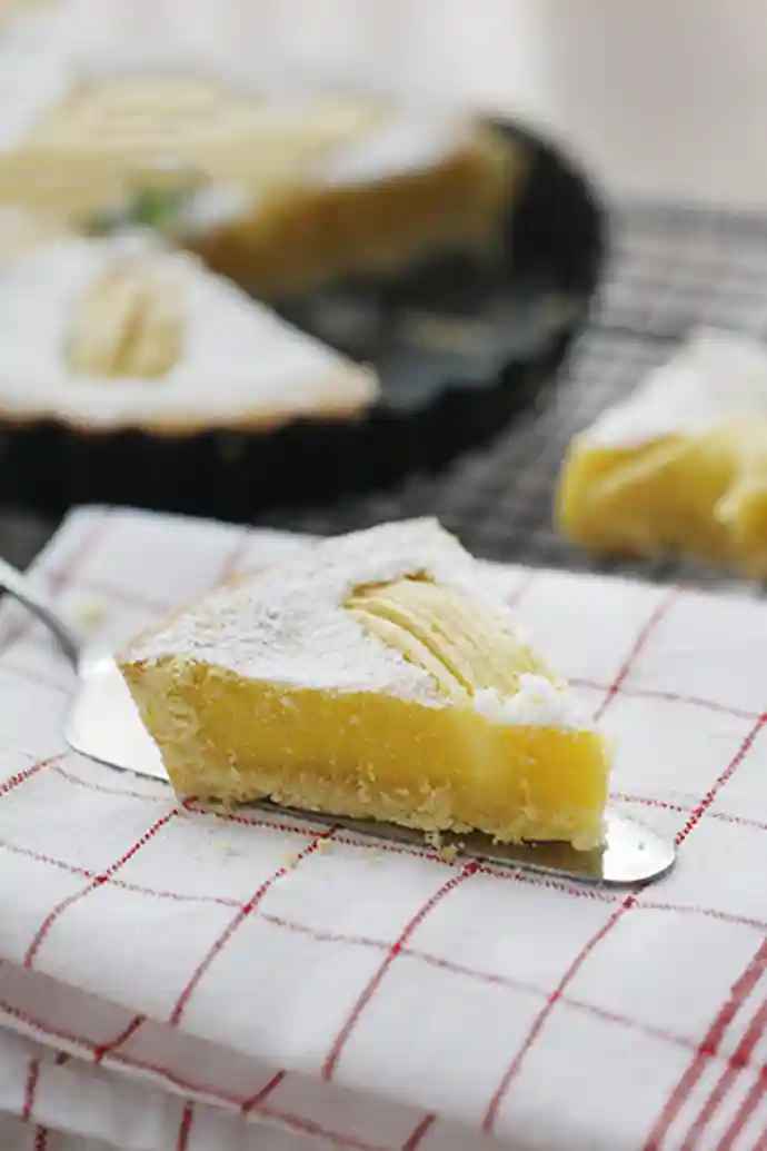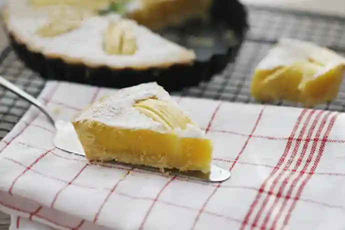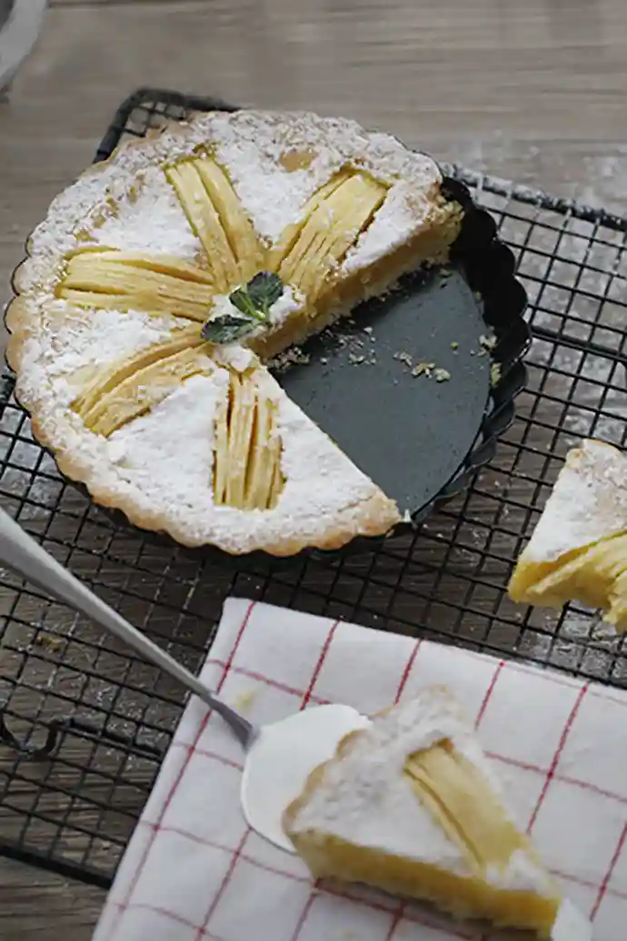 12、切好的苹果块摆入派盘中,然后把做好的面糊倒进去,放入烤箱中层180度上下火烤25分钟