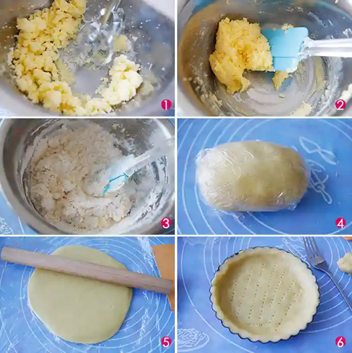 1、先做派皮,黄油提前软化,软化好的黄油加入40克细砂糖用电动打蛋器打至混合