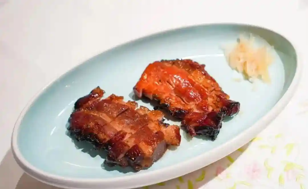 用酒点燃,烤制之后,浇上香甜可口的玫瑰蜜,再切块装盘。每一块叉烧都鲜嫩多汁,而且肉质紧致,口感和味道都做到了极致。