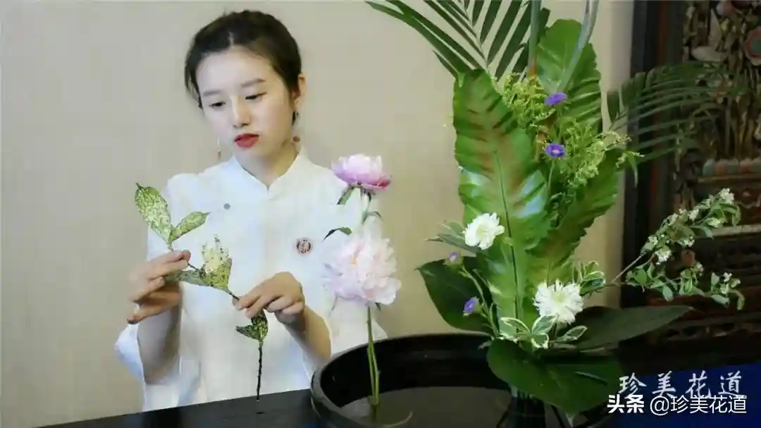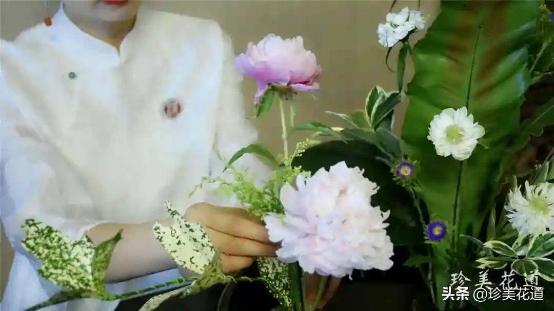 第十步在正西点的剑山,来插入副主花~芍药,插制时两只芍药保持花头的高低错落。