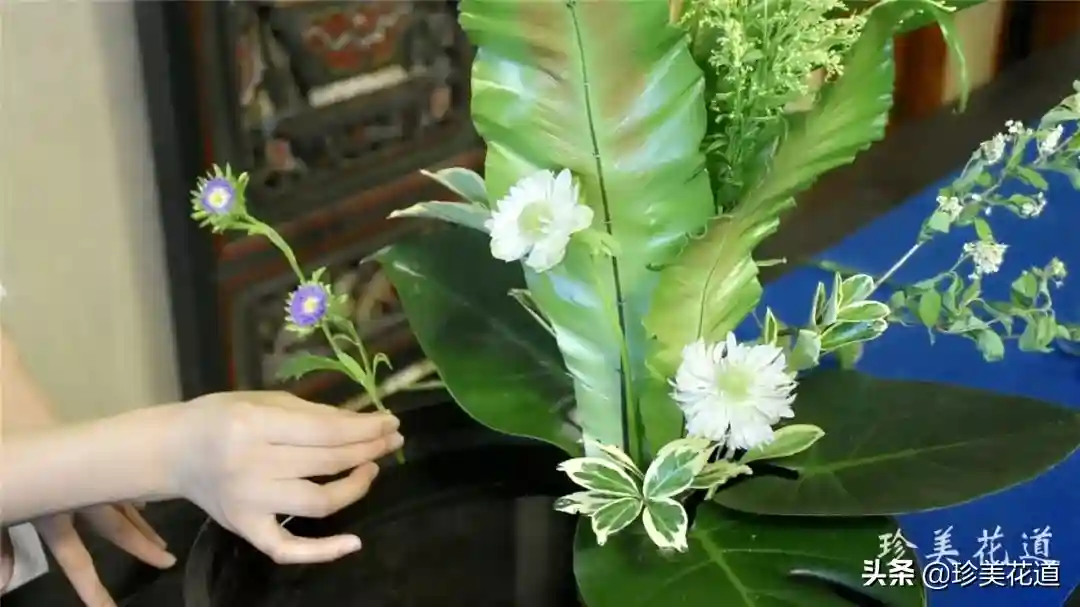第六步加入三片龟背竹作为基磐叶,龟背竹有托起整个作品的作用,三片呈螺旋上升之势。