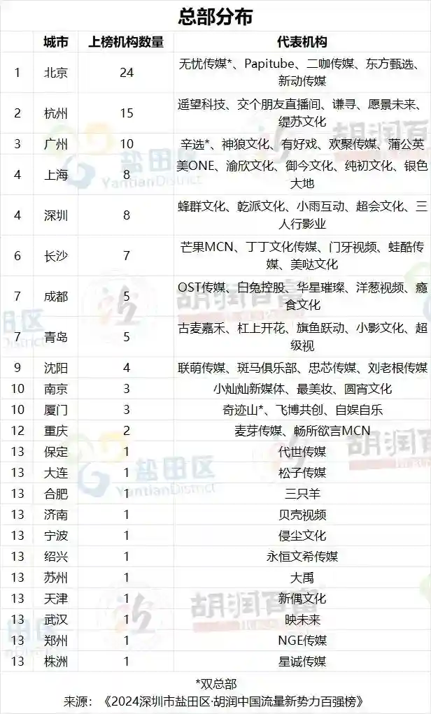 百强榜上的机构平均年龄仅7岁,却已展现出强大的市场影响力,它们平均布局三大主流平台,拥有高达3.7亿的总粉丝量,平均每家签约超过3300名达人。北京、杭州、广州、深圳、上海五大城市聚集了超六成的上榜机构,广东作为省份整体实力仅次于北京。值得注意的是,尽管仅有3家机构为上市公司,但这些机构通过与平台合作的经验和谈判能力,为旗下达人创造了巨大的价值空间。