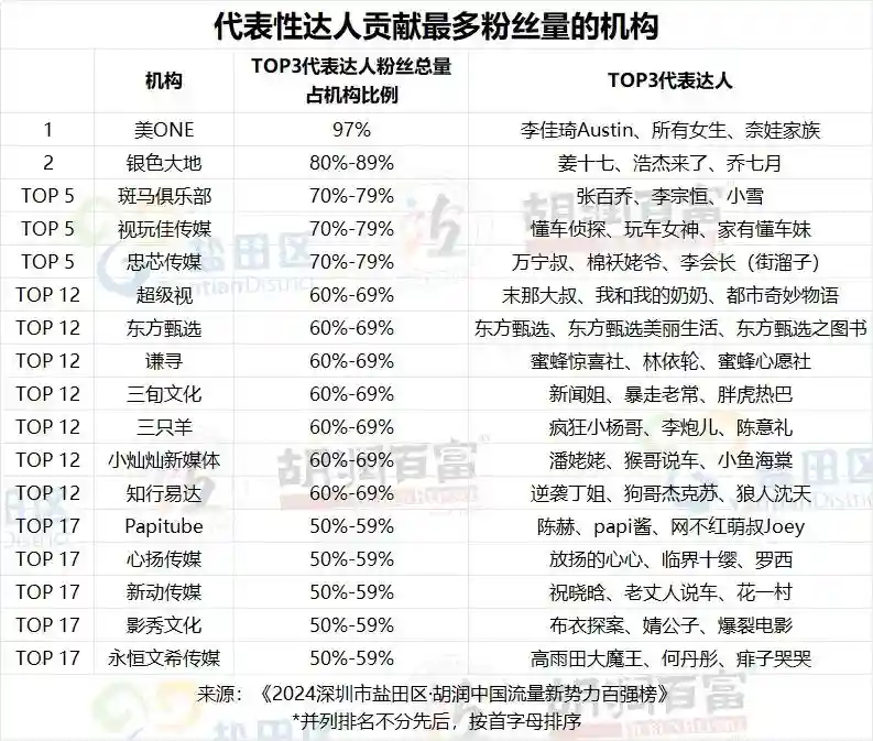 榜单前十名机构包括三只羊、无忧传媒、美ONE、遥望科技、蜂群文化、Papitube、古麦嘉禾、二咖传媒、辛选和东方甄选。其中,三只羊排名第一,旗下拥有全网粉丝数量最多的达人疯狂小杨哥;无忧传媒成立于2016年,拥有达人数量众多;美ONE成功孵化运营了“李佳琦直播间”等自有IP,李佳琦为机构贡献超过95%的粉丝量;遥望科技是首家在A股上市的直播电商公司;蜂群文化服务客户众多,签约孵化大量独家达人;Papitube由泰洋川禾创立,旗下有papi酱等代表性达人;古麦嘉禾旗下拥有近千达人;二咖传媒覆盖中美两地;辛选培养了众多销售额破亿的主播;东方甄选由新东方转型而来,俞敏洪通过东方甄选主推农产品助农。