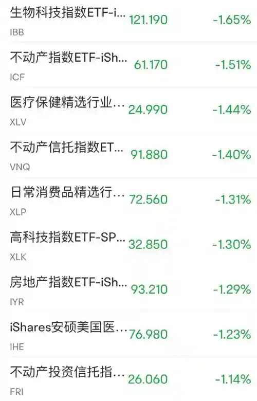 美股行业ETF周五几乎全线收跌,生物科技指数ETF跌1.65%表现最差,医疗业ETF、科技行业ETF、全球科技股指数ETF、日常消费品ETF、网络股指数ETF、公用事业ETF至多跌1.44%,可选消费ETF也跌0.92%,能源业ETF上涨1.91%,是当天唯一收涨的行业ETF。
