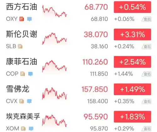 能源股集体上涨,埃克森美孚涨1.83%,雪佛龙涨1.51%,康菲石油涨2.55%,斯伦贝谢涨3.34%,西方石油涨0.54%。
