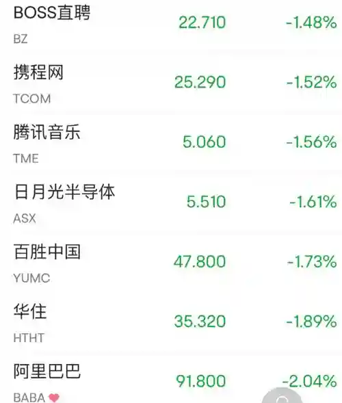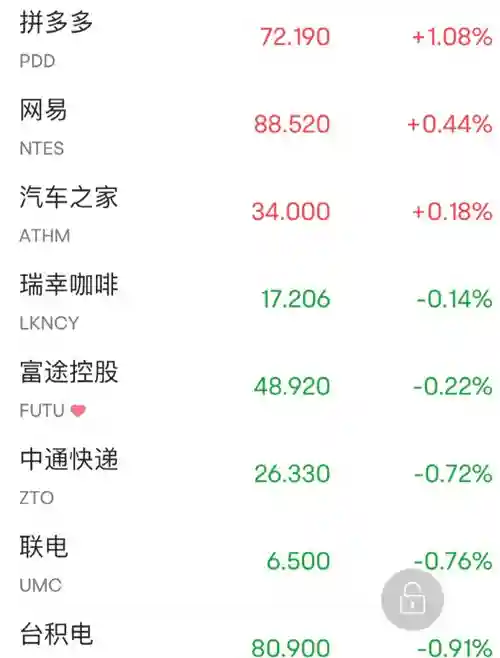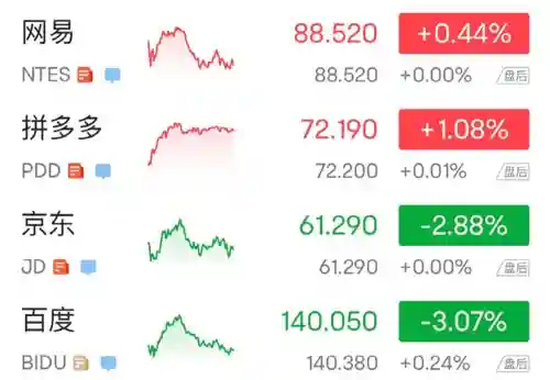 叮咚买菜跌近8%,金山云跌超7%,蔚来汽车、达达跌超5%,B站跌近5%,理想汽车、爱奇艺、好未来、满帮跌超4%,小鹏汽车、微博跌超3%,新东方跌超2%,阿里巴巴跌2%,腾讯音乐、虎牙跌超1%,而网易有道涨超5%,斗鱼涨近2%,腾讯粉单涨近0.6%。