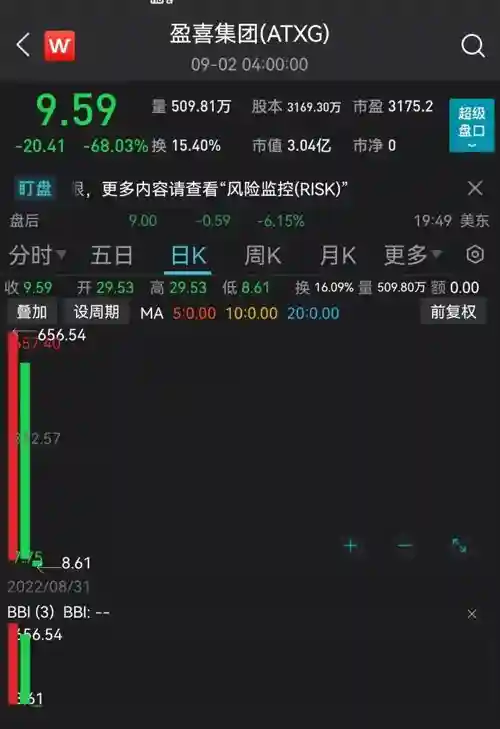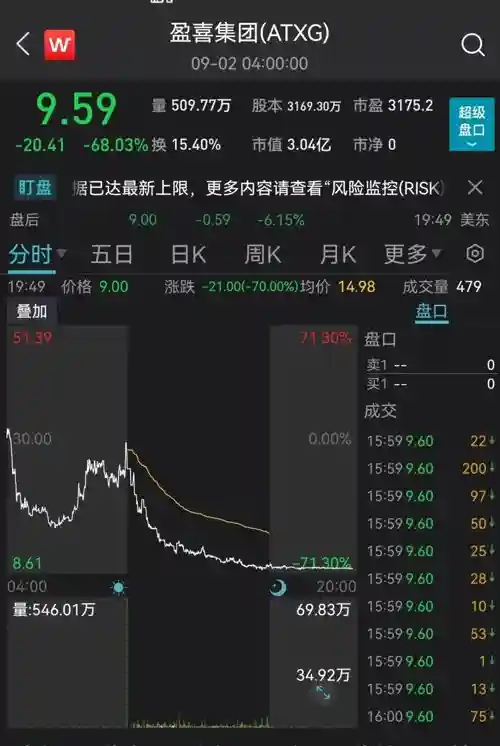 继9月1日暴跌95%之后,9月2日,盈喜集团再度大跌68%。