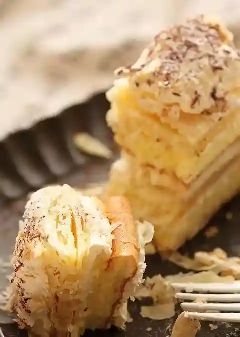法国人将拿破仑视作英雄,但凡最杰出的东西,都要冠上拿破仑之名,因此可见,拿破仑酥是怎样的美味。拿破仑酥法文为Millefeuille,即有一百万层酥皮的意思,所以又被称为千层酥,由三层啡色的千层酥皮,夹两层吉士酱制成,口感丰富,每当叉子舀下去,酥饼便应声裂开,发出清脆的声音,每吃一口,都像敲响一个音符,带来最愉悦的心情。