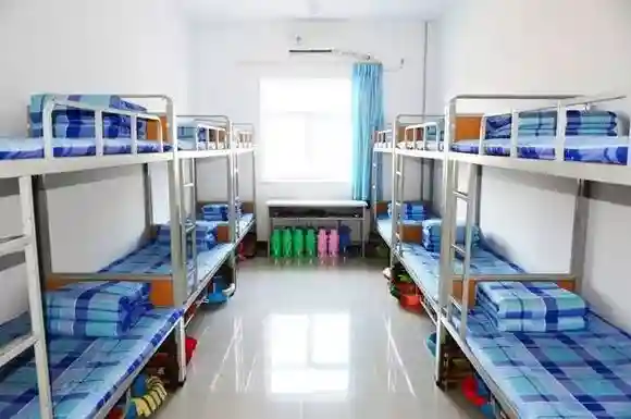 学校有6栋学生公寓,以集中管理为原则,以年级为单位整齐排列入住。标准宿舍八人一间(四组上下铺),带独立卫生间、阳台、储物柜、小桌、电扇、空调、暖气。