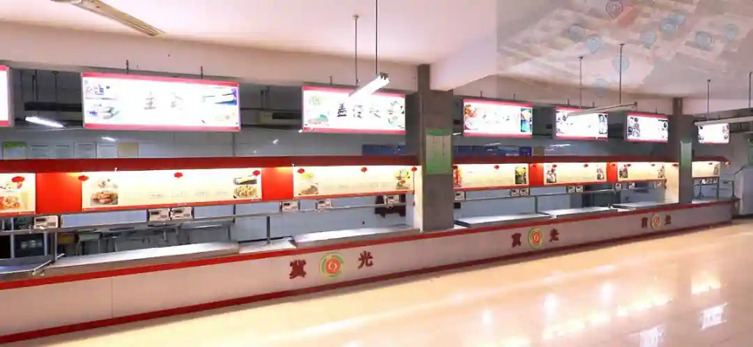 3个食堂分学生食堂与教工食堂(接受学生就餐),均有两层宽敞、气派的就餐大厅。小学部在第一食堂就餐,高中部可任意选择在第二食堂和第三食堂就餐。另外学校设有平价超市。