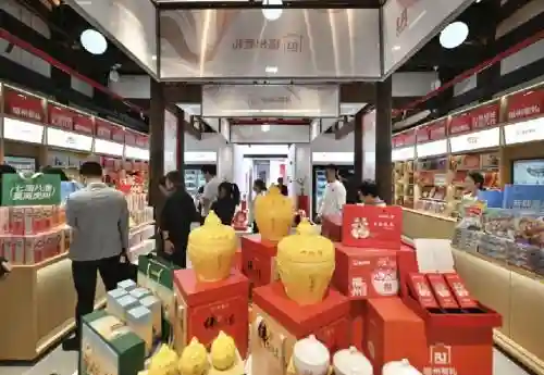 “聚福品·福州有礼”福州城市级伴手礼品牌旗舰馆作为参展供应商,组织涵盖了聚春园、安泰楼、民天、立日有、尚干餐饮等14家福州老字号企业,展出聚春园佛跳墙、闽式糕点、闽味传统小吃、地瓜烧、青红酒、调味品、肉松、拌面、扁肉、茉莉花茶系列、大漆美学器皿、永泰特产等丰富产品,是参观游客一站式购买福州伴手礼、年货产品的好去处。展区中还包含一个单独的直播区域,向线上观众同步展示福州特色产品,吸引消费者购买。