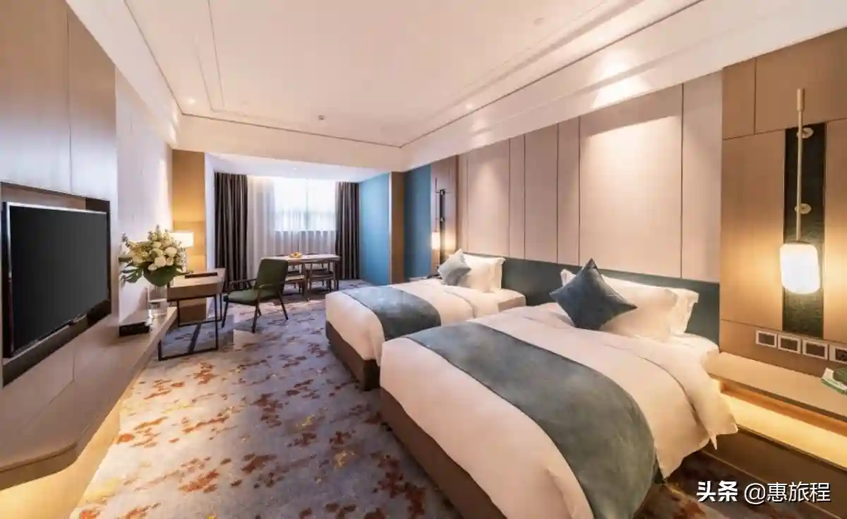 双床房配套一个独立阳台,夜晚灯光璀璨的温泉园景格外诱人;