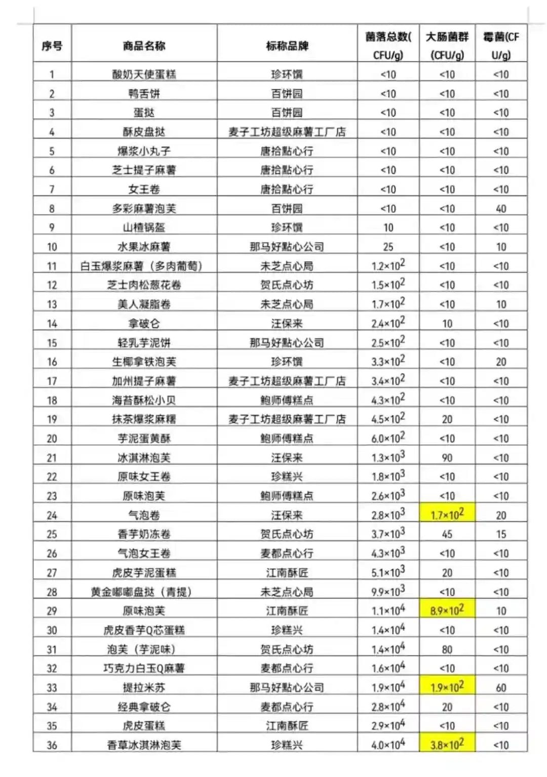 本次比较试验36件样品的菌落总数、霉菌均未超过国家标准规定的菌落总数最大限量值。但是,有“汪保来”气泡卷、“那马好點心公司”提拉米苏、“珍糕兴”香草冰淇淋泡芙、“江南酥匠”原味泡芙4款样品的大肠菌群超过国家标准规定的大肠菌群最大限量值(大肠菌群≤100CFU/g),不符合标准率为11%。