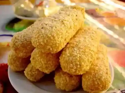 芝麻条,又叫“麻芝”。个头大,外面抖一层芝麻,由糯米、麦芽糖掺和的,黏黏糊糊,诱惑挡不住。装假牙的人可就吃不得了。