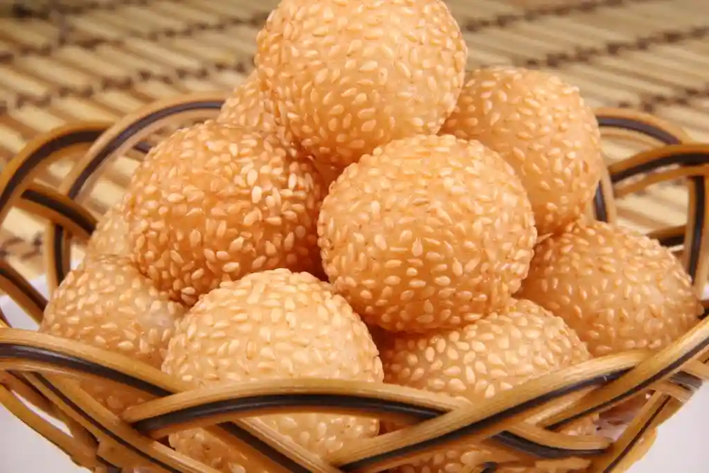 糯米洗净泡水,磨制成水磨粉团。红糖加水熬成糖浆,糯米粉团加入糖浆,反复揉和制成坯。用坯包上豆沙馅,成为油生坯,面贴花生仁1粒即成。把生坯放入油锅,用铁勺轻轻翻动,等油皮亮膨胀似球形,色呈焦黄时,就可捞起来沥干油。