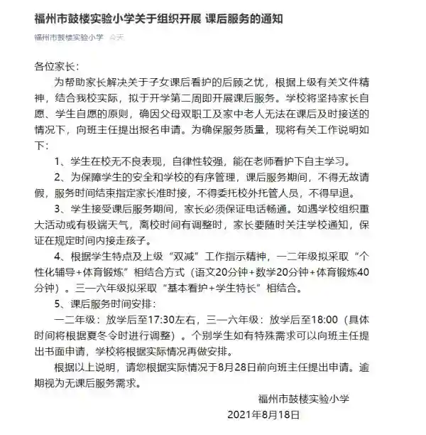 鼓楼实验小学在通知中表示,拟于开学第二周即开展课后服务。学校将坚持家长自愿、学生自愿的原则,确因父母双职工及家中老人无法在课后及时接送的情况下,于8月28日前向班主任提出报名申请。