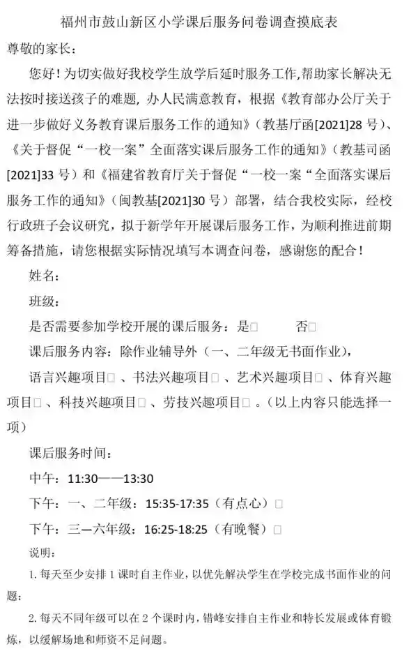 位于晋安区的鼓山新区小学向学生家长发出调查摸底表。根据这份调查摸底表,学习提供的课后服务时间不仅有下午放学时段,还包含了中午时段。此外,下午放学时段,学校还计划提供点心和晚餐,可以说是非常的贴心。