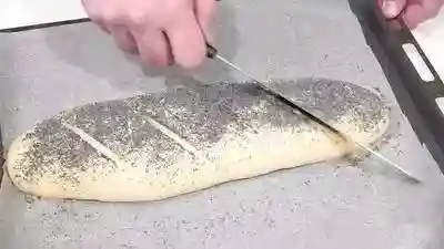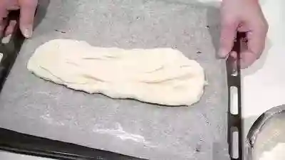 轻轻的用手将面团搓揉至长条形并像手一样宽,发酵30分钟左右,刷上蛋清,然后用刀在面团表面,从45°角均匀划开,在200℃下烘烤25-30分钟,直到表壳呈金色。