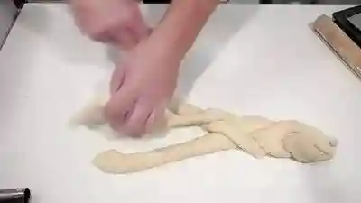 将面团分成3等份,搓成细长条形,然后向编辫子一样,编制成型。最后一个编制的总是在中间,发酵30分钟左右,刷上蛋清,在200℃下的烘烤25-30分钟,直到表壳呈金色。