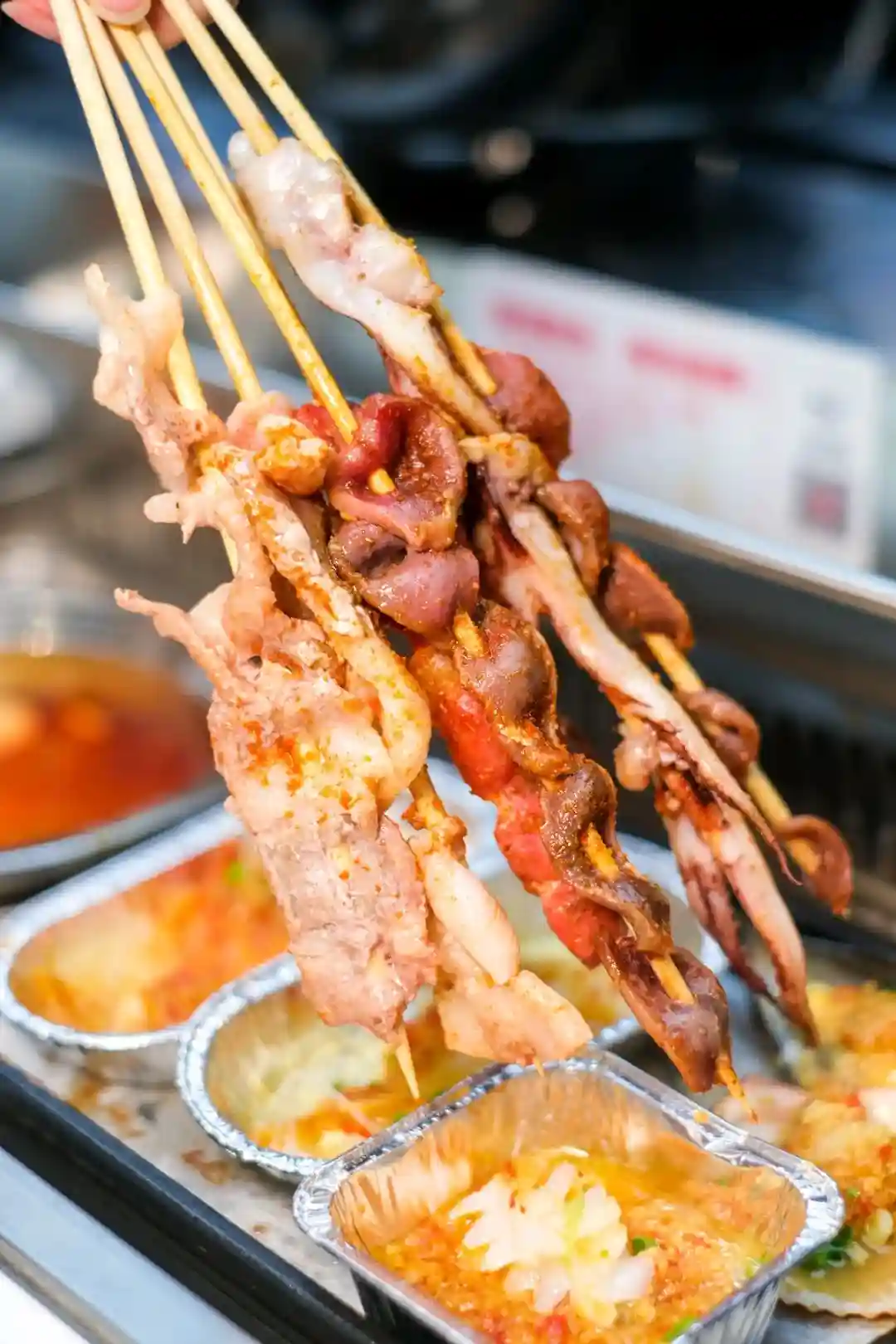 光是锡纸海鲜类,就足够令人眼花缭乱,鲜虾、鱿鱼花、虾仁、花蛤应有尽有,并且全部都提前调味好了,满满的蒜蓉香气。