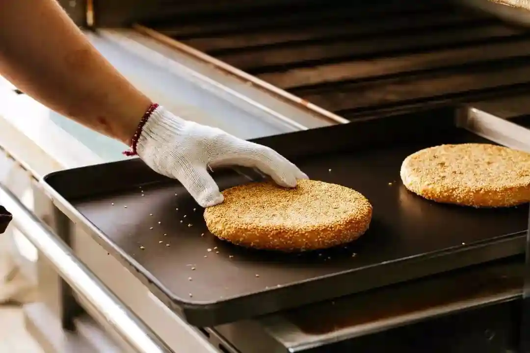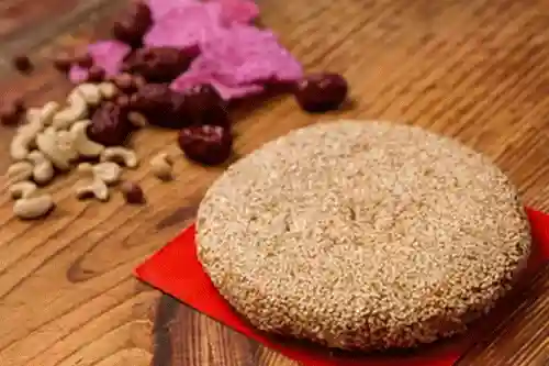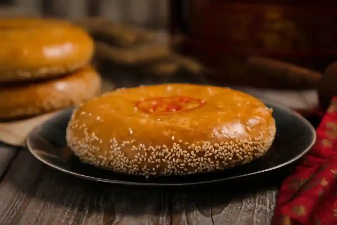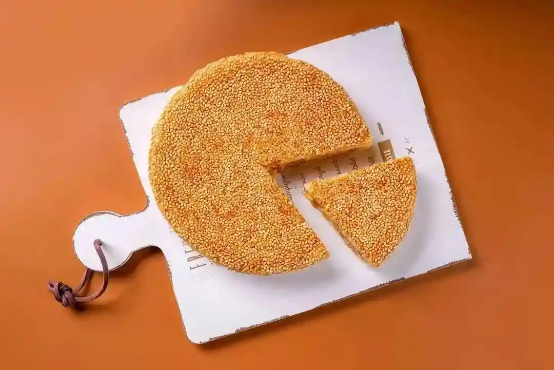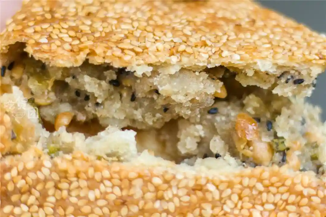 饼上铺满了严严实实的一层白芝麻,白芝麻烤得香喷喷的,令人难以抗拒。