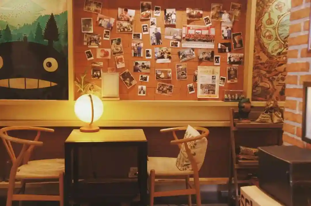 宽大的招牌,鹅黄色墙面,木质家具。挂满证书和奖状的红墙边,地球仪台灯温热发光,照片墙和龙猫装饰画生动却不张扬。