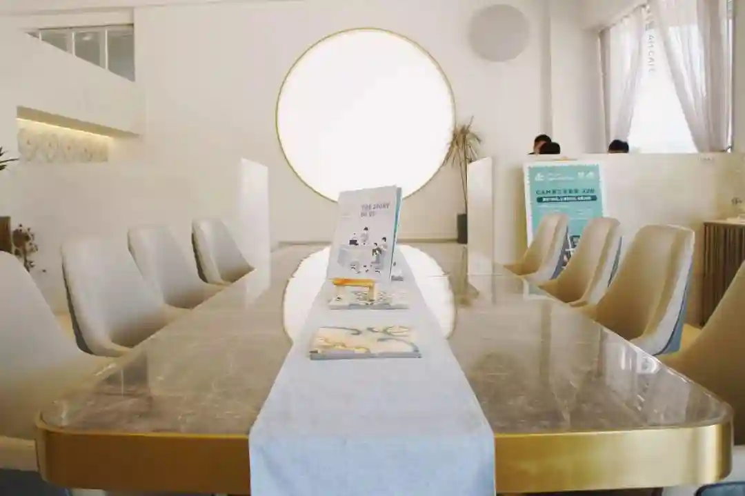 坐在室内的长桌旁,纯白的屋子通透宽敞,一眼望见落在墙上的「月亮」。