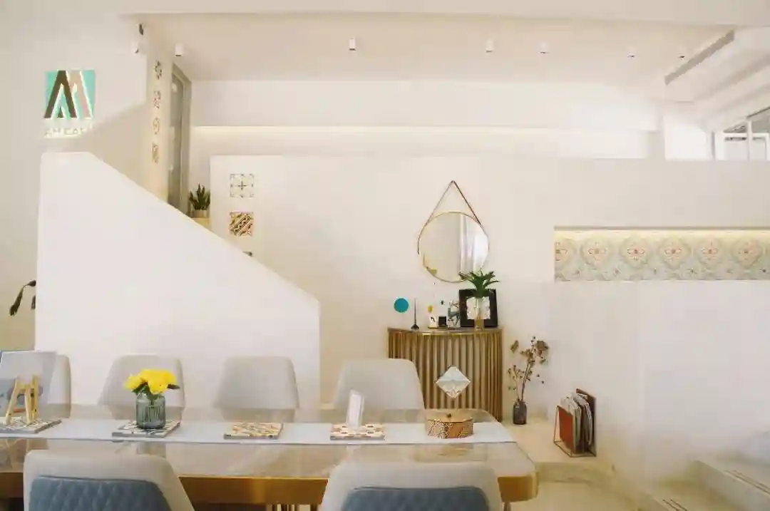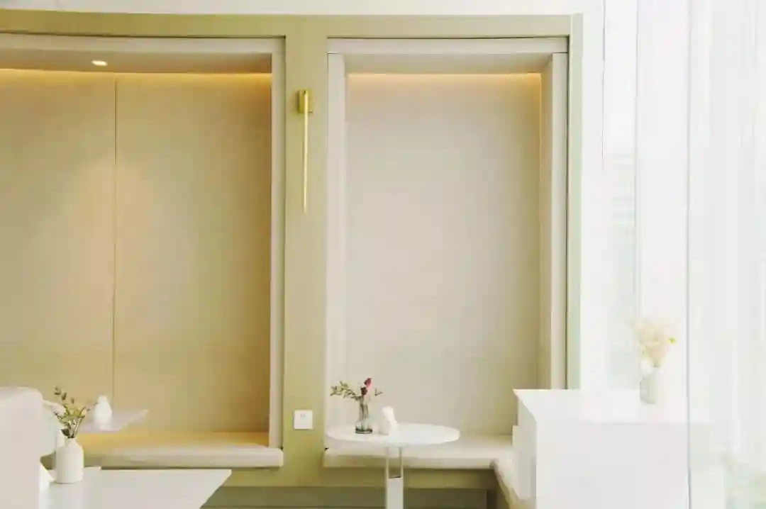 浅色系的家具,大大的玻璃外墙,能清晰地望见街道外绿树张扬。