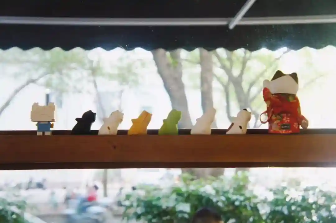 走在儿童公园路,阳光越过树叶的缝隙,大剌剌地踩出斑驳的脚步,印满灰蓝色的招牌。躲在招牌下慢象咖啡的木质门窗,就像《海街日记》的小屋。