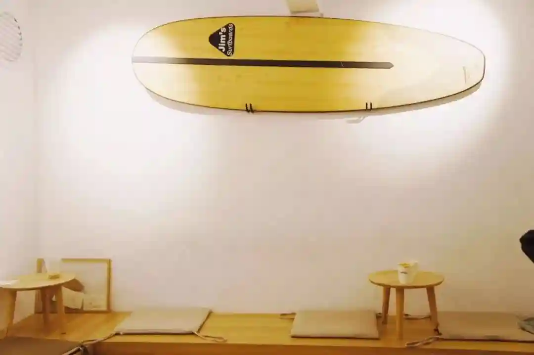 老板很健谈,墙上挂着的滑板和冲浪板,显露着他的酷劲儿。