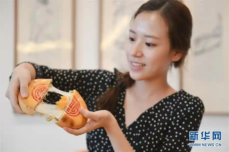 9月25日,在福州老字号糕点企业百饼园,一名顾客在体验经过馅料和口感创新的福州传统糕点——礼饼。新华社记者宋为伟摄