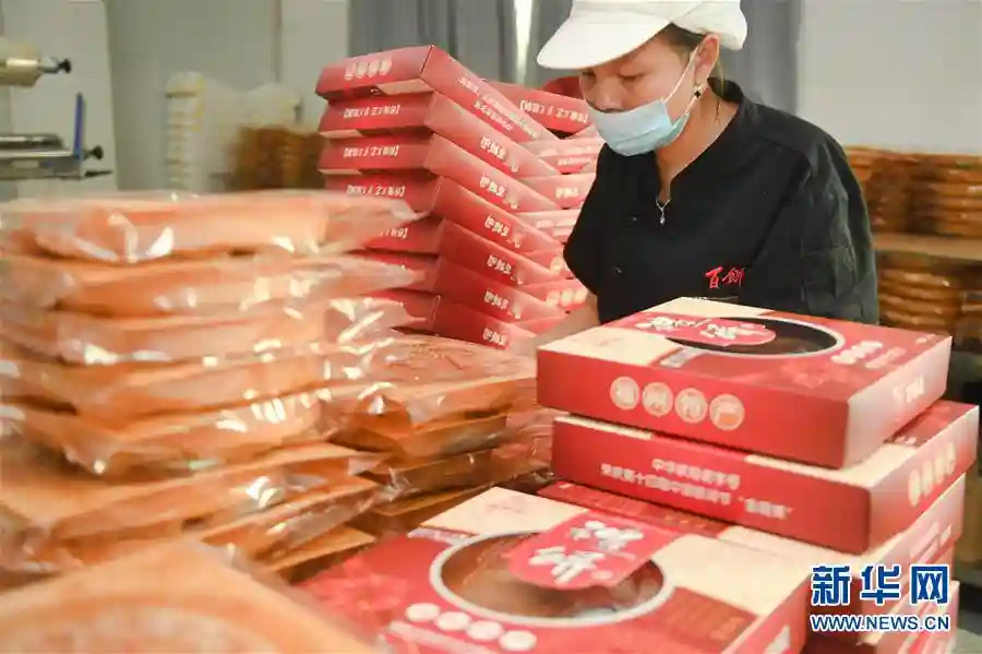 9月25日,在福州老字号糕点企业百饼园的加工车间,工人在包装简装平价福州传统糕点——礼饼。新华社记者宋为伟摄