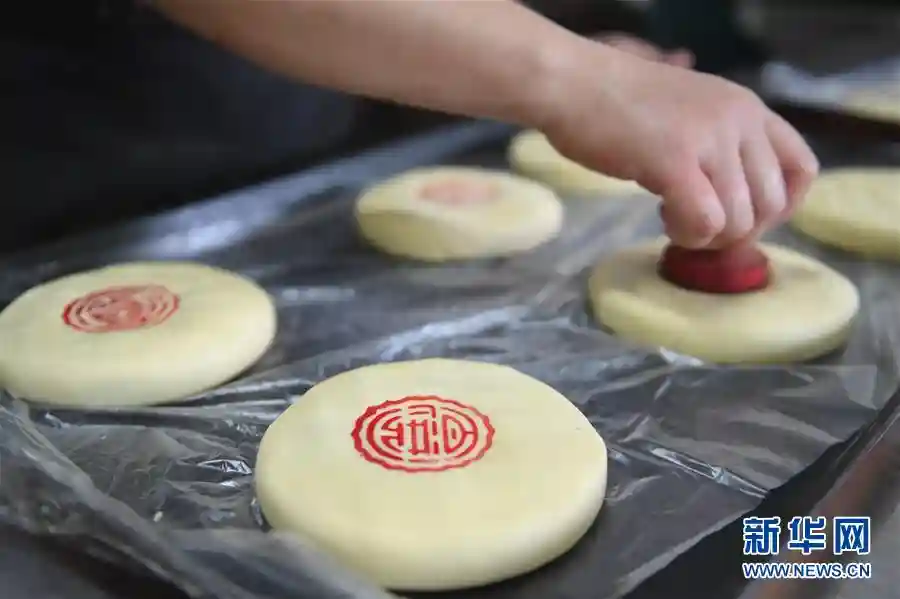 9月25日,在福州老字号糕点企业百饼园的加工车间,师傅为福州传统糕点——礼饼印上图案。新华社记者宋为伟摄