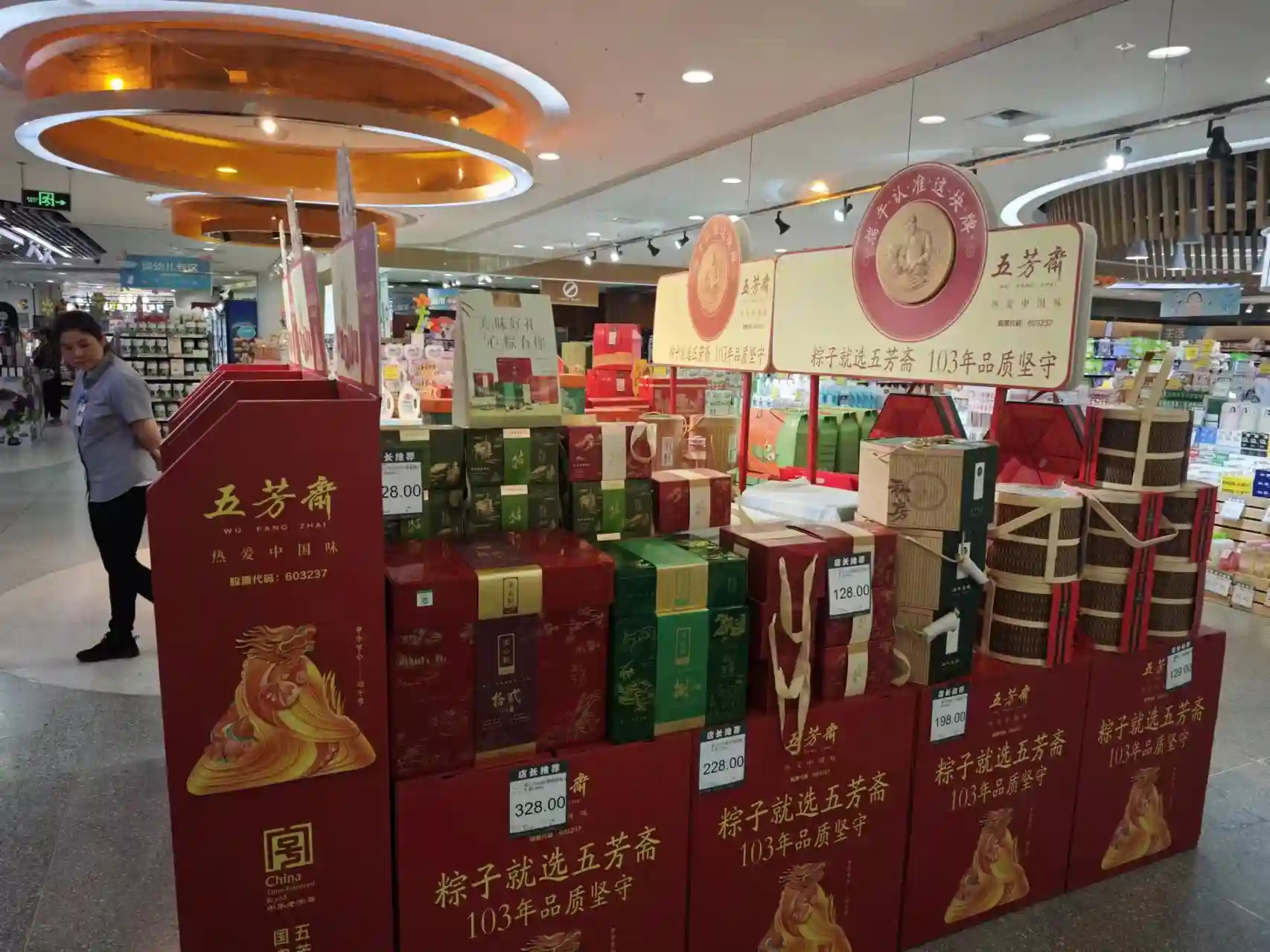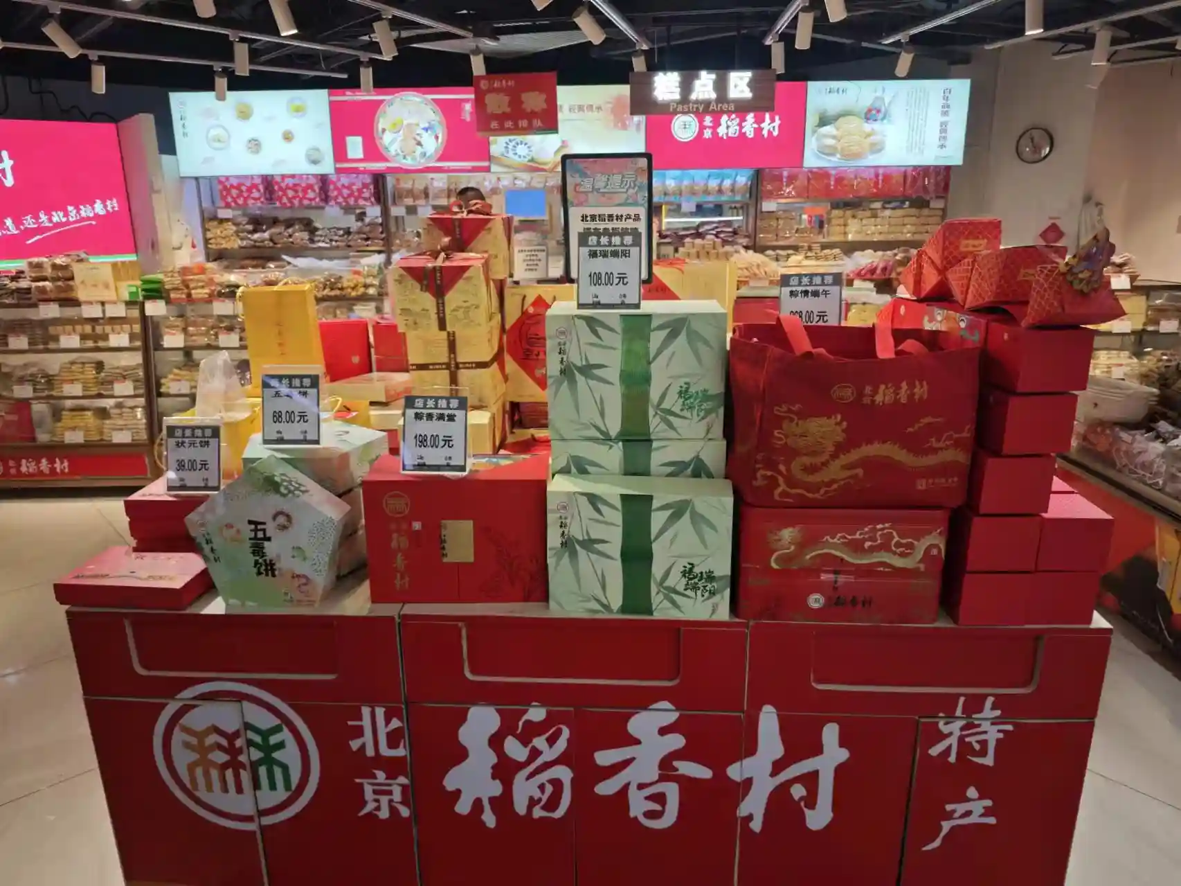 6月5日,北京市东城区新世界百货、永辉等超市,五芳斋、仿膳、年糕杨、全聚德、北京稻香村、苏州稻香村均搭建起粽子礼盒促销堆头,售价在68元到428元不等,多数礼盒在200元以下。在低温短保产品区,三全食品主打网兜装、袋装、盒装的龙舟粽,思念食品推出网兜装粽子、盒装“V粽”。常温展台,三全、思念、五芳斋、年糕杨、仿膳等品牌均推出了小包装常温真空粽,售价在3.9元到22.8元不等。