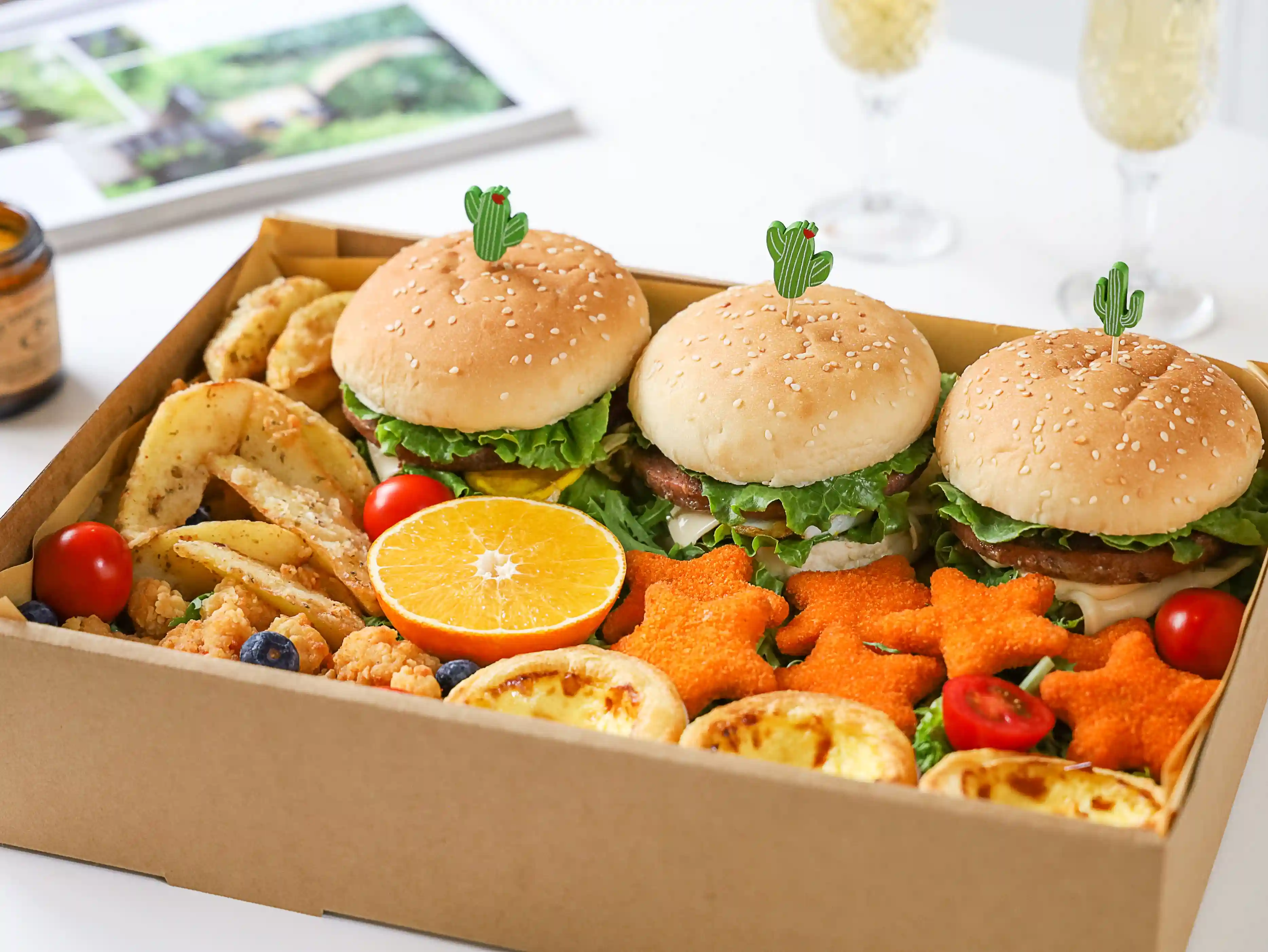 8.所有食材摆放在盒子里,可以自己爱吃的水果、蔬菜装饰一下,咱们的下午茶就做好了!