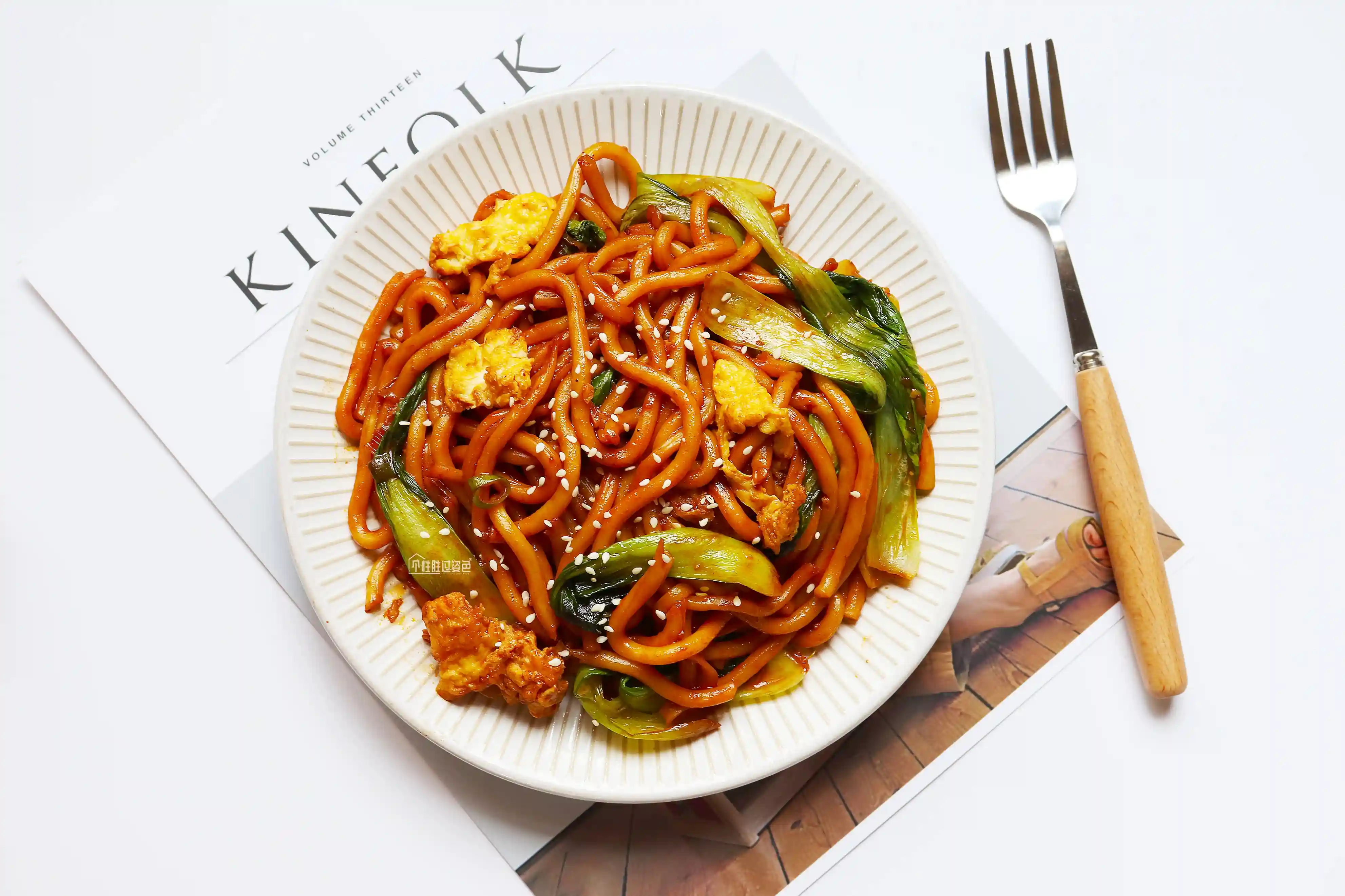 4.乌冬面+青菜+鸡蛋块放入空气炸锅,喷点油,200度烤10分钟即可