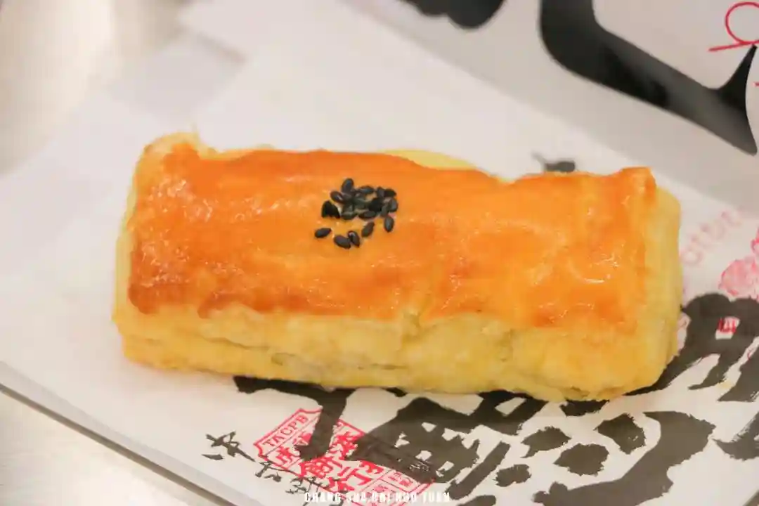 酥脆的表皮缀了几颗黑芝麻,看起来就很有食欲。为了不弄脏衣服,保持优雅的吃货形象,吃的时候一定要用手拖在下面,因为咬一口,酥皮就会一层层地掉下来。