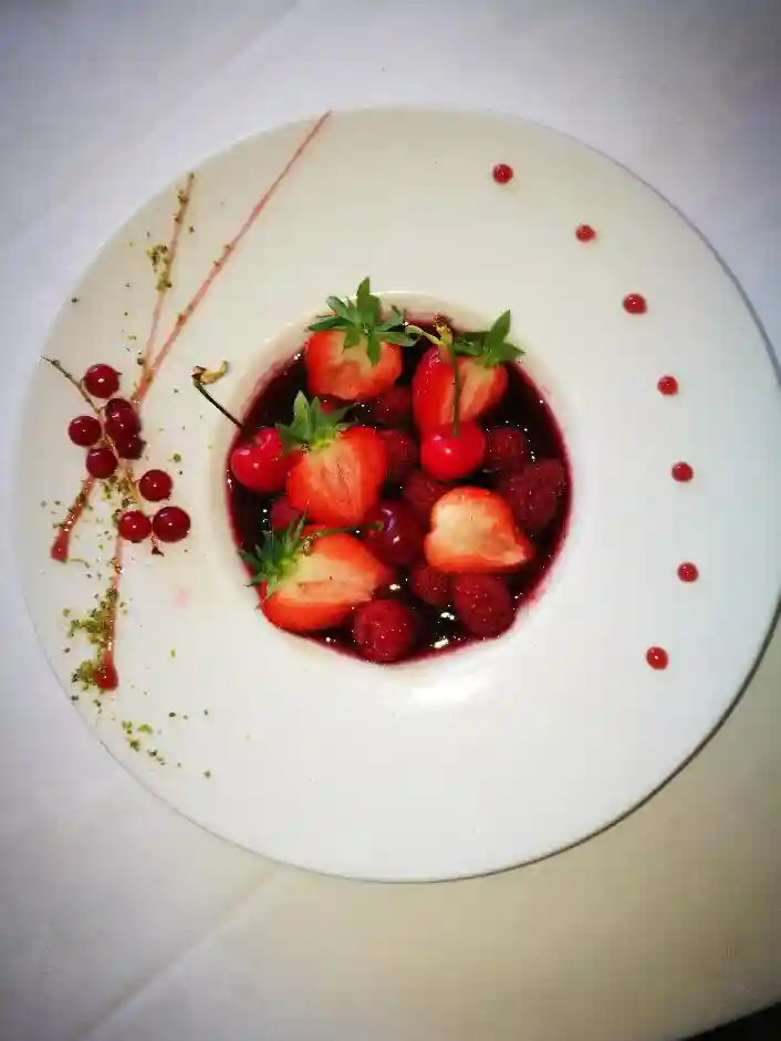 将适量冰淇淋放入盘中,淋上红酒汁即可享用美味。