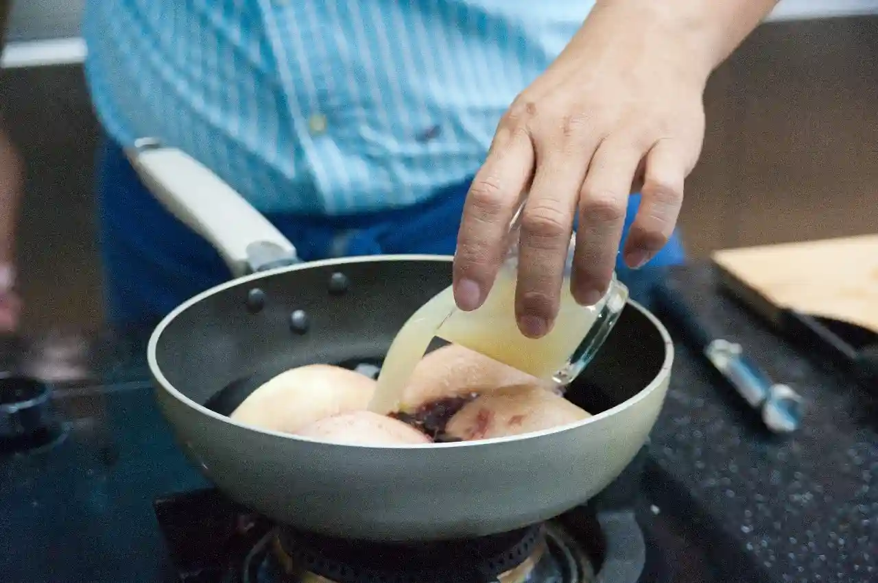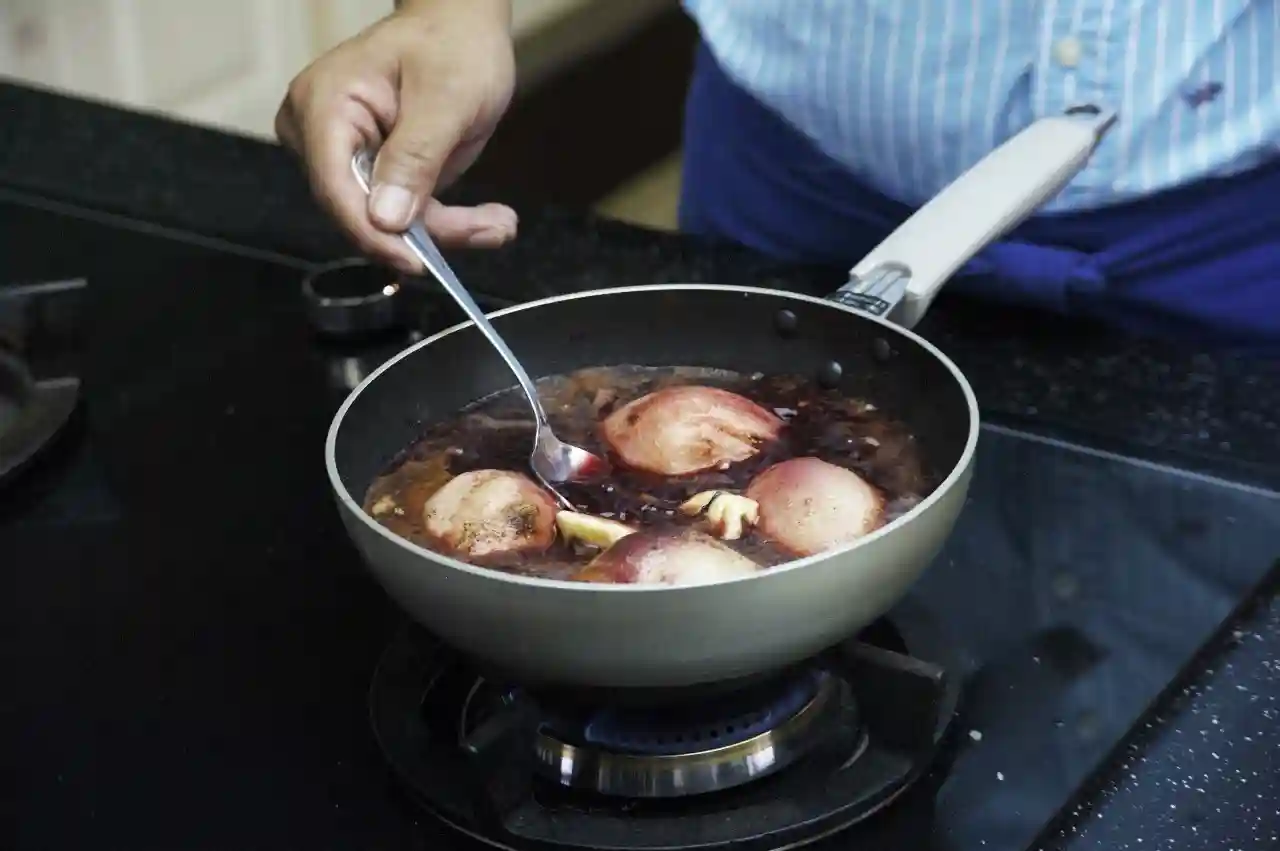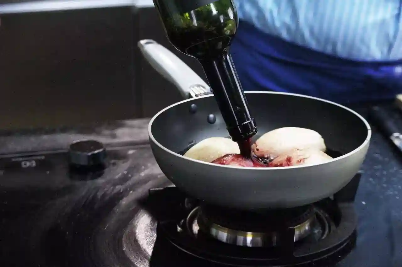 将切好的西洋梨放入锅中,倒入红酒淹没西洋梨。