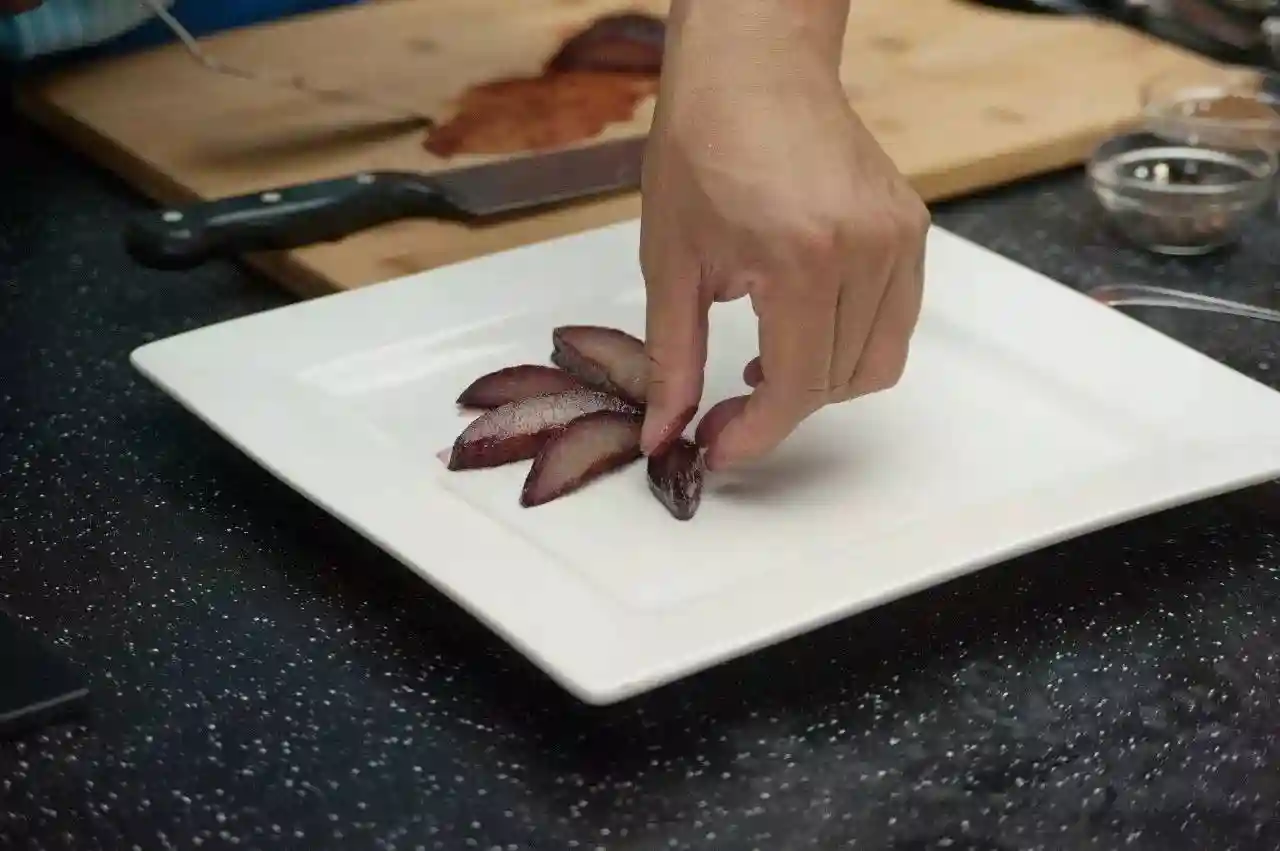 将煮好的西洋梨拿出,切片摆盘。