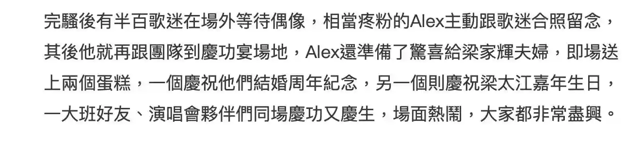 梁家辉夫妇此次到台北就是纯粹支持好友杜德伟,同场的还有其他香港好友,比如钟镇涛夫妇,上山诗钠等。大家难得在异地相聚,该庆祝的,该聚会的,都不会少。因为都是冲着支持杜德伟而来,而杜德伟也感受到了朋友的热忱,不只是在演唱会现场感谢了这些好友,而在庆功宴的时候,还专程为梁家辉及其妻子庆祝,可见他非常有心意,不介意让自己庆功宴变成好兄弟的主场。