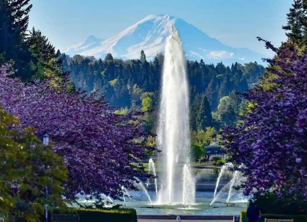 华盛顿大学校园颜值非常高,尤其每年3-4月樱花绽放时,与远处的雪山交相呼应,美不胜收!