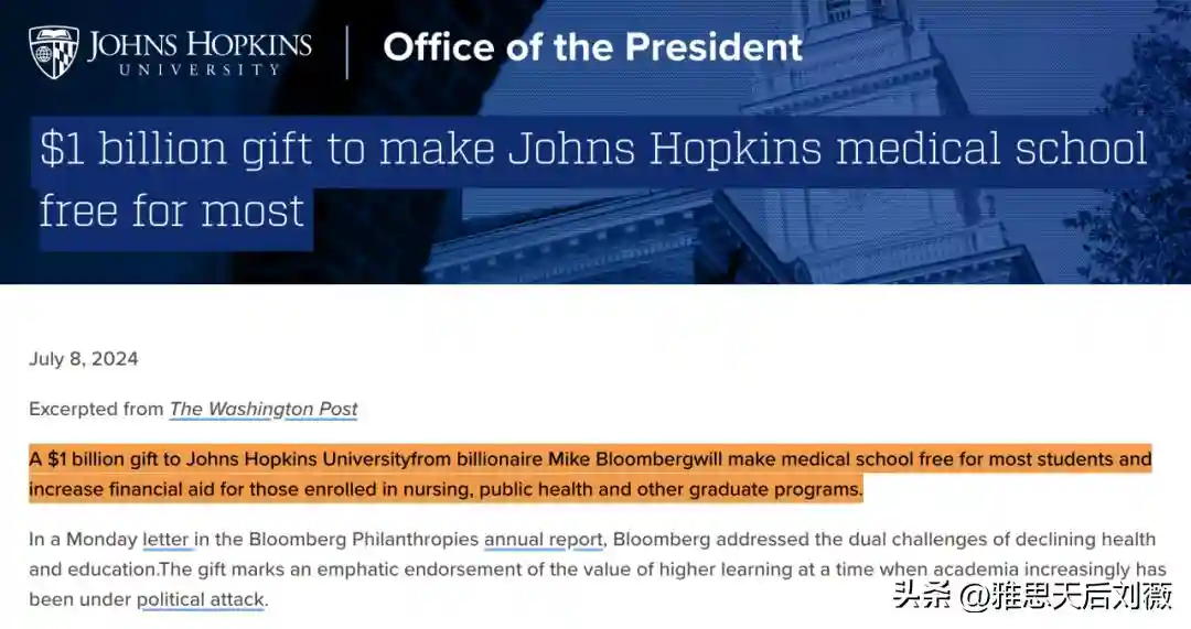大学官网显示:10亿美元捐赠——约翰霍普金斯医学院大部分学生免费上学。