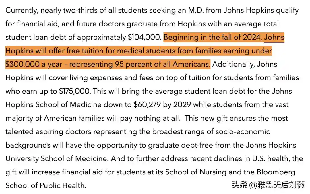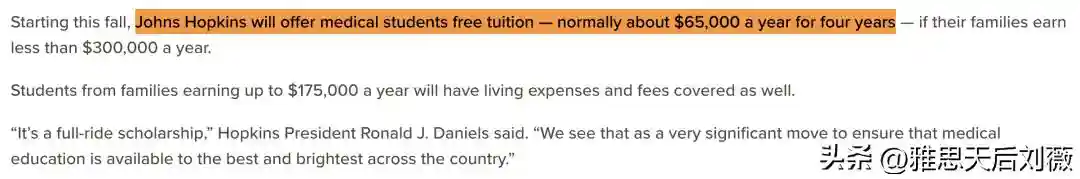 从今年秋季开始,约翰霍普金斯大学将为家庭年收入低于30万美元的医学院学生免学费,通常该校四年的学费约为6.5万美元/年。