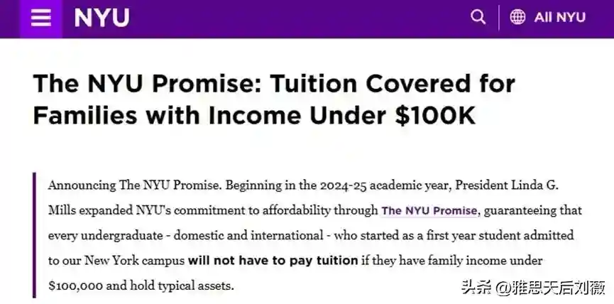 根据官网说明,这一政策适用于国际学生。只要在纽约校区注册、是大一本科新生、家庭年收入低于10万美元,并且持有一般资产即可。对于其他年级的学生,学费政策也将会进行后续的相应调整。